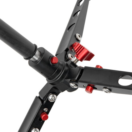 Четыре секции из карбона с клипсовыми зажимами из ABS пластика. Диаметр секций — 32, 28, 25, 22 мм. При ослаблении клипсового фиксатора — возможна регулировка зажима винтом под шестигранный ключ. На верхней секции предусмотрены: накладка-рукав из вспененного материала для комфортного удержания монопода в холодное время года и кистевой ремень для удобства удержания монопода рукой. Круглая площадка верхней базы монопода имеет реверсивный винт 1/4″ – 3/8″, на который крепится видеоголовка, а при необходимости непосредственно камера. Пузырьковый уровень находиться на круглой площадке и имеет возможность вращаться вокруг центральной колонны.