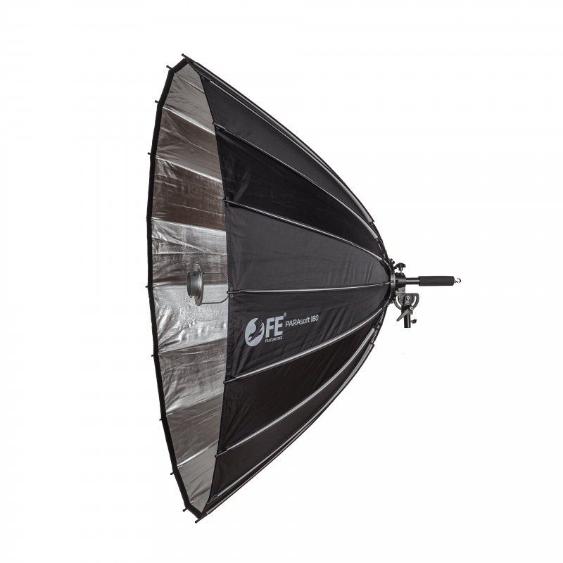 Зонт-отражатель Falcon Eyes PARAsoft 180 – сверхбольшой параболический рефлектор диаметром 1800 мм. Помимо отражателя с наклонным кронштейном, в комплект входят фокусировочная штанга, адаптер для вспышек с байонетом Bowens, тканевый рассеиватель, мешок для песка (груз-противовес) и сумка для переноски. Внутренняя серебристая поверхность рефлектора с высокой отражающей способностью и фокусировочная штанга, помогают формировать яркое освещение с настраиваемым углом светового потока.